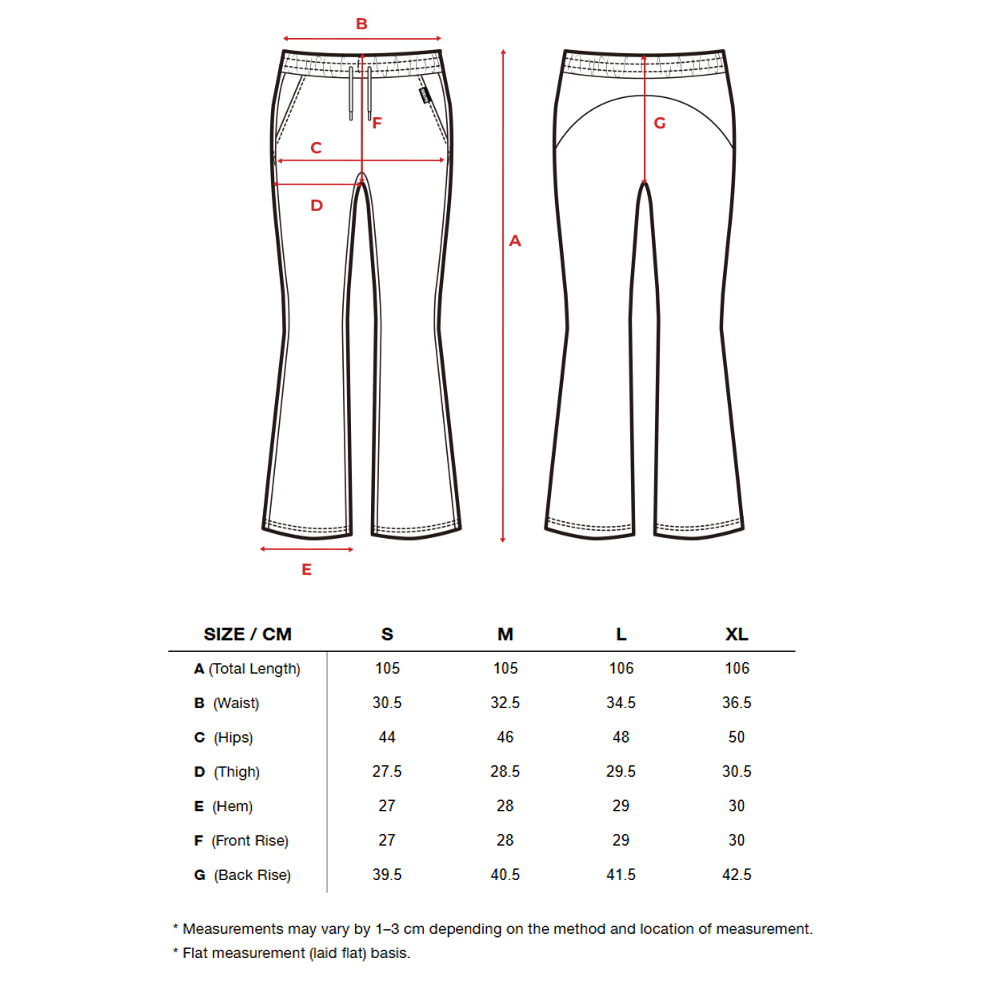 The slim fit around the hips gently flares toward the hem, creating a longer, leaner leg line with a sleek finish.