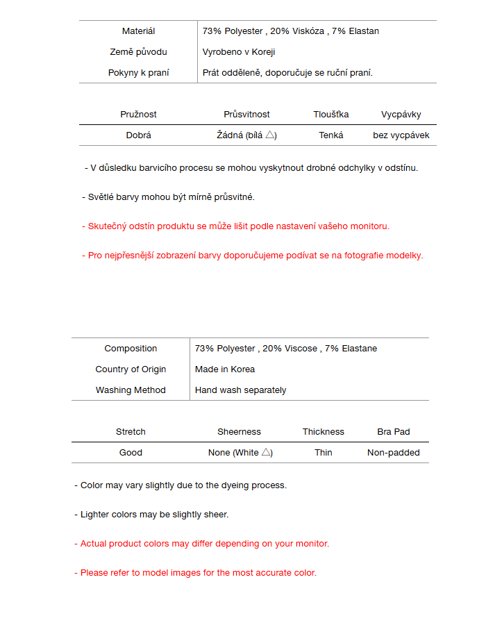 • Tmavé oděvy mohou prosakovat – před nošením perte odděleně.